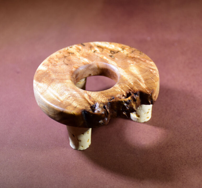 I turned this bottle stopper from the highly figured, lightly spalted, beautiful piece of maple burl that has some traces of previous larvae occupation. I wanted this project to be an example of natural edge wood turning. This bottle-stopper goes to my friend, George from West Bay Woodturners, as my “thank you” for giving me an opportunity to work with such beautiful wood.